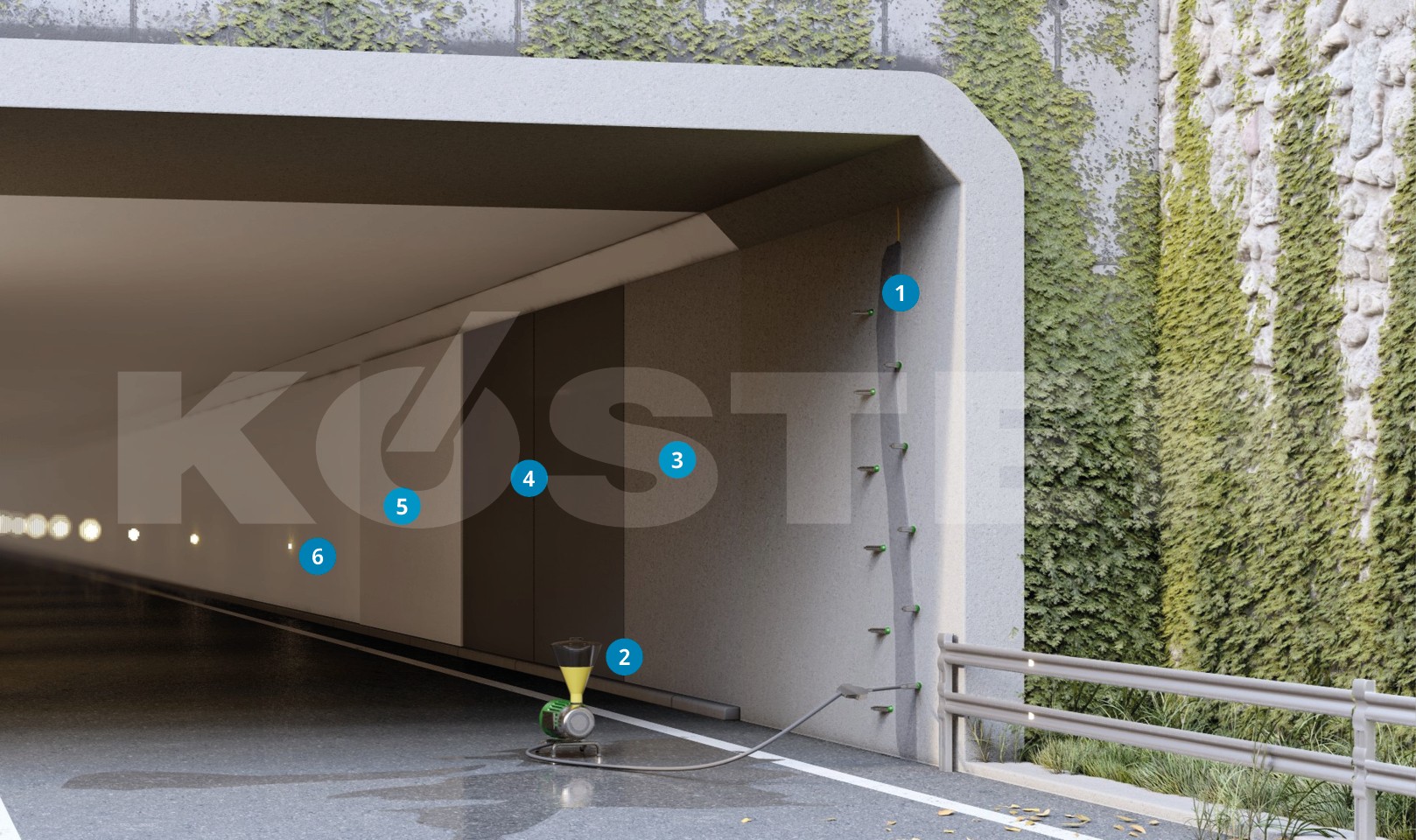 Systemet er egnet til brug i lukkede tunnelkonstruktioner. Flydende vand standses ved injektion med KÖSTER IN 1 og lækagen tætnes vedvarende elastisk ved straks efter at injicere med KÖSTER IN 2. Mindre lækager eller fladeutætheder kan standses med KÖSTER Kældertæt 2 Blitzpulver. Fladetætningen (negativtætningen) sker over hele fladen med KÖSTER NB Tætningssvumme 1 grå på den tørre, bæredygtige undergrund. Efter hærdning påføres KÖSTER CFR 1 som revneoverdækkende belægning på den tørre, tætnede undergrund. Dernæst påføres et lag sprøjtebeton. Tætningen ligger dermed inde i betonkonstruktionen.