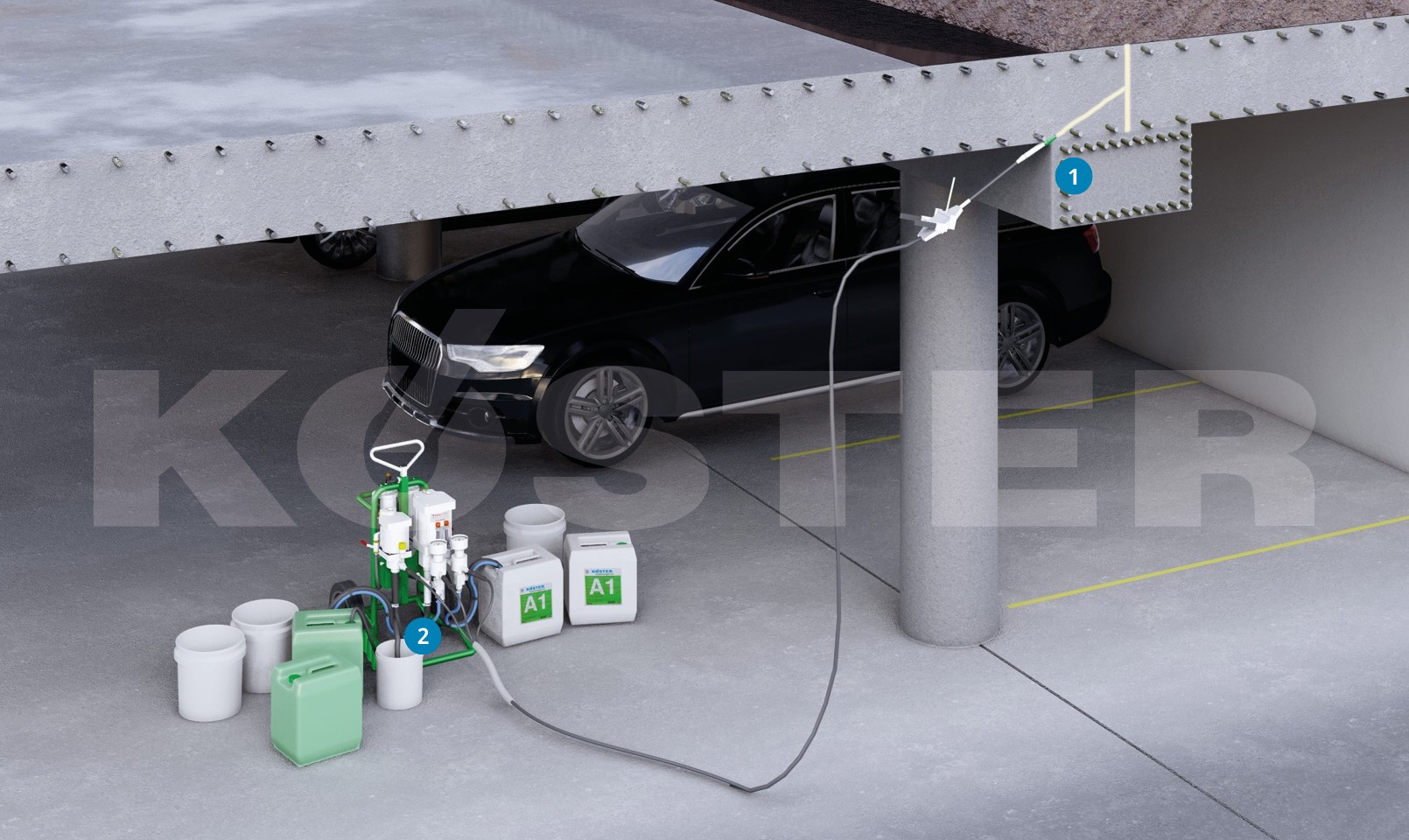 KÖSTER Superpakninger monteres i borehullerne. Ved fuger i dæk bør fugespalten forsegles med KÖSTER Injektionsbarriere, for at undgå at injektionsmaterialet flyder væk. I den her viste situation kan sikringen for eksempel ske ved at spartle en hulkel i overgangen mellem bærebjælken og dækket. En anden mulighed er forinjektion med KÖSTER Injektionsgel S4, der kan reguleres til en kort reaktionstid. Der anvendes kun den mængde materiale der er nødvendig til at forsegle utæthederne.