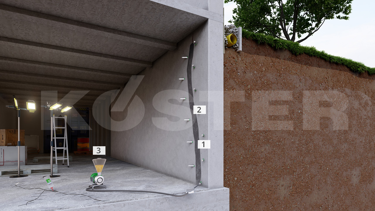Injektionsmaterialerne anbringes i revnerne med KÖSTER 1K Injektionspumpe via injektion gennem pakninger. Dertil kan anvendes flere forskellige typer pakninger: KÖSTER Superpakning (flere varianter) benyttes til alt fra lavt til meget højt tryk. KÖSTER Super En-dags-pakning har en ekstra ventil, hvis overdel kan demonteres straks efter injektionen. Den centrale del af pakningen forbliver i væggen og forhindrer injektionsmaterialet i at løbe ud, mens borehullet kan spartles ud umiddelbart efter og arbejdet afsluttes med det samme.