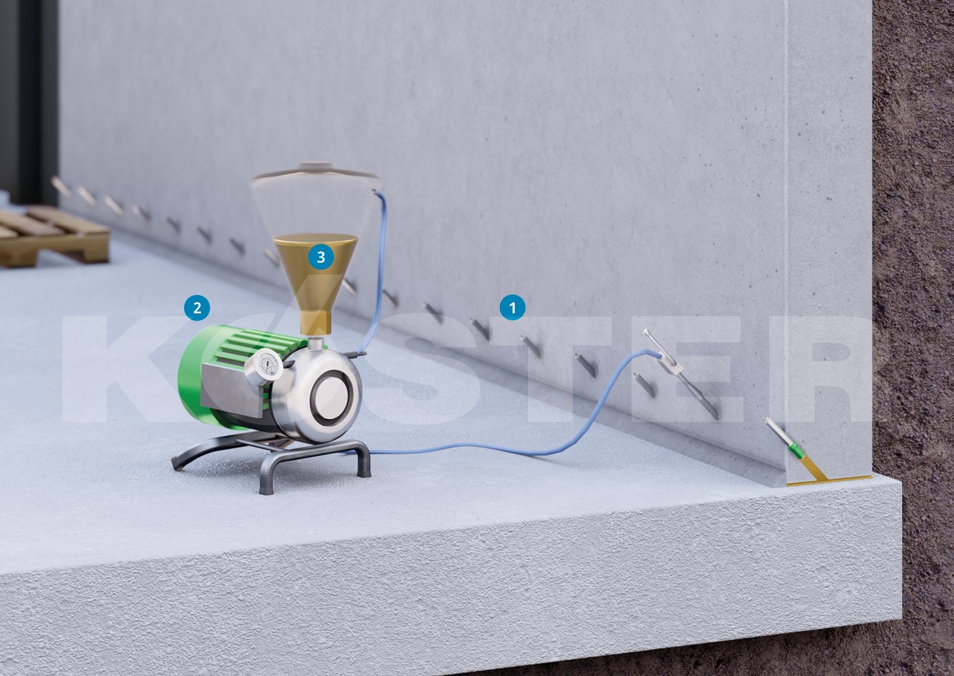 Ved strømmende vand, eller hvis det ikke vides om revnen er tør eller våd, injiceres med KÖSTER 2 IN 1. Det er et fremragende CE-mærket polyuretanprodukt, som i tørre revner danner en elastisk massiv harpiks, mens det i våde revner danner et højelastisk skum. Det sparer tid og logistik på byggepladsen, kun at have ét produkt. Ideelt injiceres flere gange efter hinanden indenfor forarbejdningstiden, for at sikre en vedvarende og elastisk tætning af fugen.