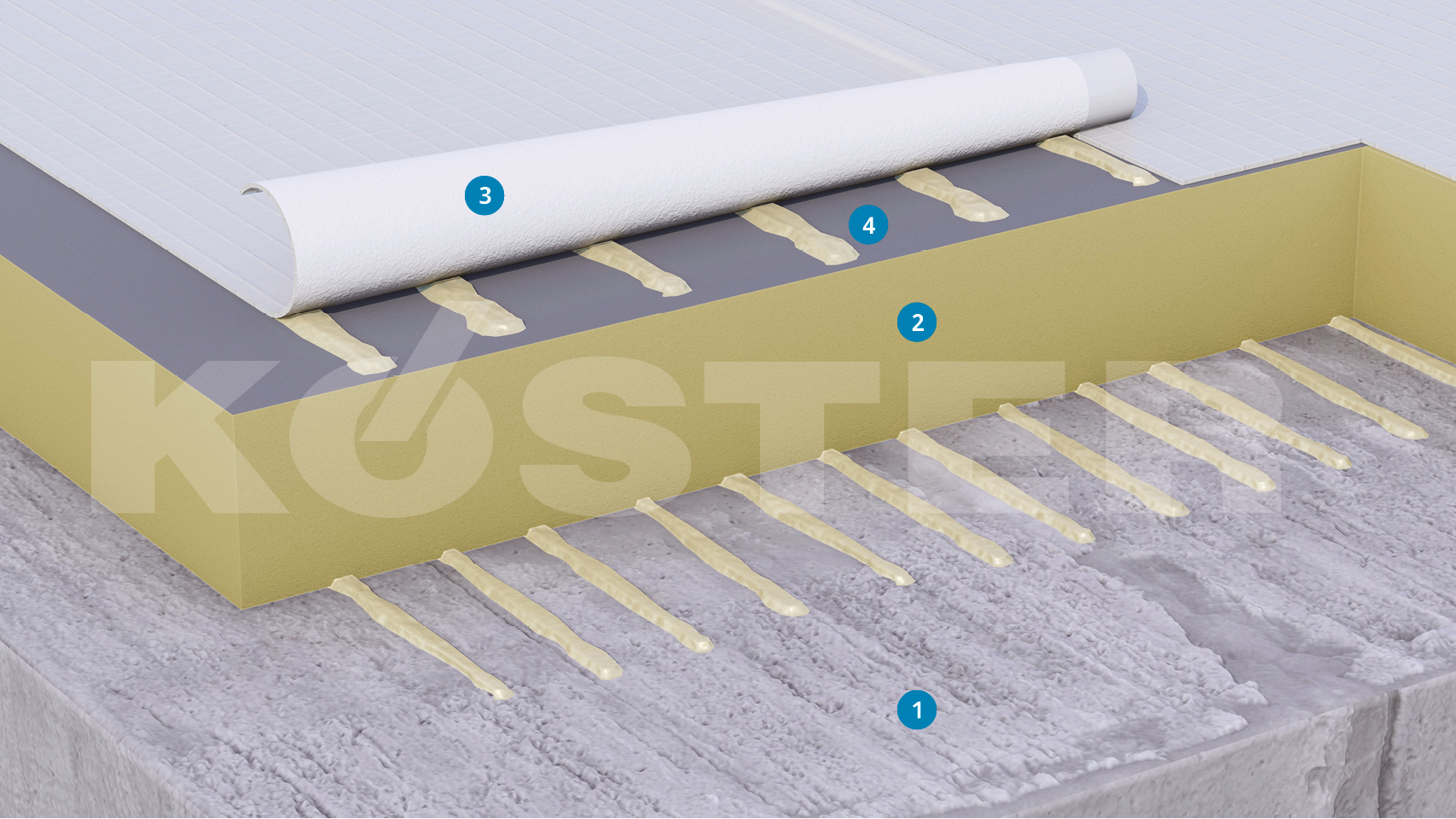 Full surface adhesion to the substrate offers a time-saving installation. The KÖSTER TPO Membrane features a special fleece coating which increases the bonding of the KÖSTER Polyurethane membrane adhesive. This results in a high adhesive strength and creates a perfect bond to the substrate. It is important that the substrate is suitable for a good adhesive bond. If necessary, an adhesive bridge can be applied. In addition, a wind load calculation must be carried out prior to the adhesion of the membrane in order to provide information about the amount of adhesive required and the alignment of the welding seams. The KÖSTER Polyurethane membrane adhesive is applied in strips to the substrate, the fleececoated KÖSTER TPO Membrane is unrolled, and the membrane is firmly pressed onto the substrate using a rubber hand roller. This enables the adhesive to be spread evenly and help achieve uniformity of the bond. When distributing the adhesive care must be taken to ensure that no material is applied to an area that is to be welded to another sheet.