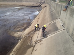 Emergency repair of sections of the facing of compensating basin. Sealing and restoration of the joints between the different sections of the construction with KÖSTER PUR Gel, KÖSTER SB-Bonding Emulsion, and KÖSTER Repair Mortar. Sealing and restoration of the cracks in the vertical walls with KÖSTER 2 IN 1 and KÖSTER KB-Fix 5.