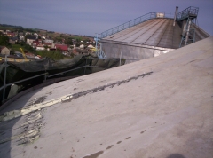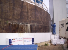 Uszczelnienie żelbetowych ścian oraz kopuły zbiornika Wydzielonej Komory Fermentacji WKF. Pęknięcia w ścianach i kopule zbiornika uszczelniono metodą iniekcji żywicą poliuretanową KÖSTER 2 IN 1. Połączenie ścian z kopulą zbiornika doszczelniono za pomocą iniekcji w węże iniekcyjne żywicą KÖSTER IN 5.