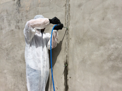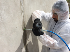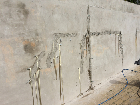 Injecção de fissuras e juntas em muro de contenção com resina de dupla activação KOSTER 2IN1 e posterior selagem negativa com duas camadas de KOSTER NB1 Grey.