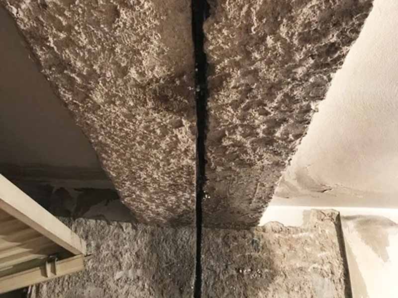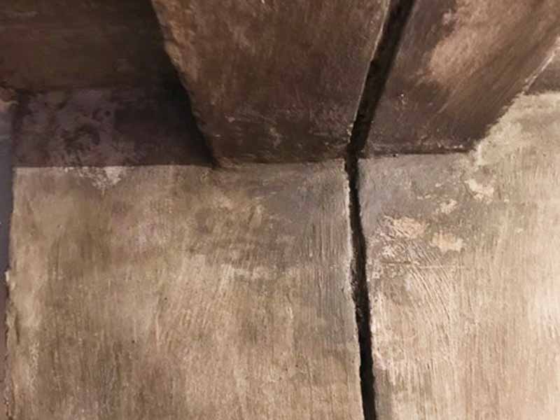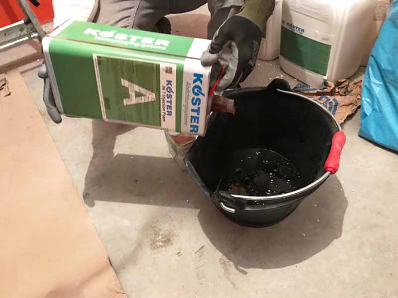 Heavily leaking expansion joints on underground car parking underneath external garden and the building walls. First the joint was sealed with KÖSTER KB-FIX 5 and injected with KÖSTER IN 7 to stop the running water and create a temporary barrier. After the injection only small areas where still having drops of water and the concrete beams remained wet. After the injection the applicator used unwoven oakum and soaked it with a solution of 50/50 water and KÖSTER PUR Gel, and stuffed the pieces into the expansion joint to create an elastic sealant inside the joint. Afterwards, the concrete beams and surrounding walls were mechanically cleaned and then primed with KÖSTER Polysil TG 500 followed by 3 layers of KÖSTER NB 1 Grey. In the end the last layer was hardened with KÖSTER Polysil TG 500. The applicator left the site for 3 days to allow the full curing of the materials. After 3 days the joint flanks where cleaned and prepared with KÖSTER FS Primer 2K and lastly the expansion joint (3 cm wide) was sealed with the joint sealant KÖSTER Joint Sealant FS-V Grey.